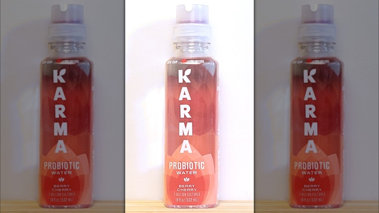 Karma makes flavored probiotic water. I thought this brand deserved high marks for creativity. The probiotics are stored in the cap, which has a built-in plunger that releases them when it's time to drink. Once the seal is broken, the probiotic can be shaken into the water. Karma claims to store its choice of probiotic, called BC30, in a shell that keeps these cultures alive until they can be absorbed by the digestive tract.