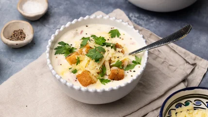 This rich and creamy chicken cordon bleu soup, created by Tasting Table recipe developer Jennine Rye, is inspired by the French cordon bleu dish. Succulent pieces of chicken are fried and then cooked with salty ham in a richly creamy and cheesy broth. Served with a generous garnish of croutons, parsley, and cheese, this soup makes a wonderfully comforting homage to the French bistro classic. While this modern take on the cordon bleu may not have been on the menu in ancient Mesopotamia, it will always be on ours — and, perhaps on your weekly dinner menu, too.