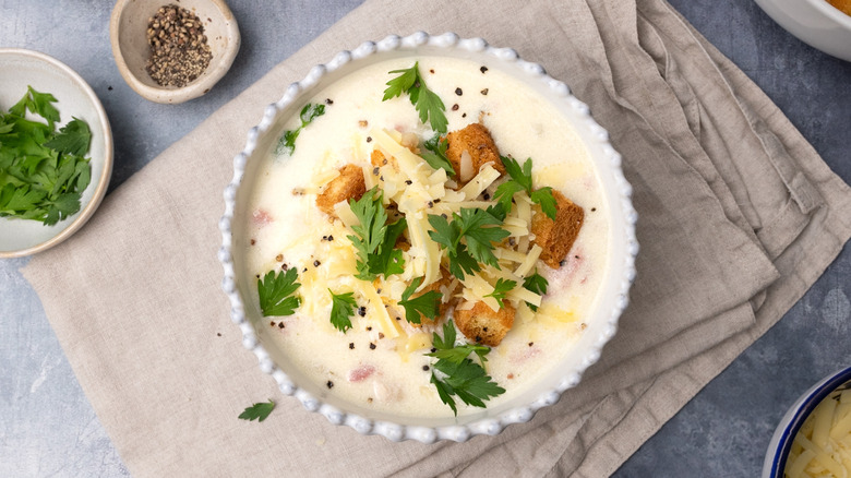 - Serve the soup topped with croutons, a little more grated cheese, and fresh parsley.