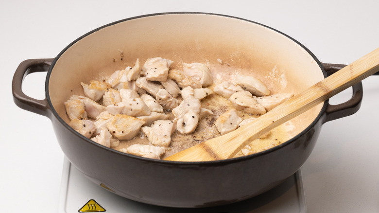 - Add the diced chicken to the pan and season well with salt and pepper.