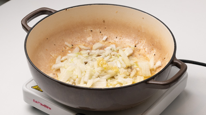 Add the diced onion and garlic and fry for 6 to 8 minutes, until the onion is soft and translucent.