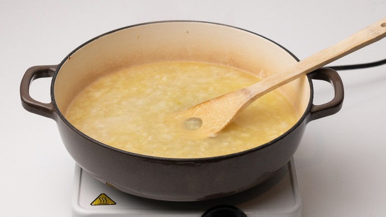 - Stir until the ingredients are combined and the soup is simmering gently.