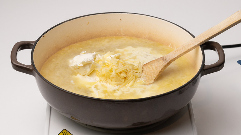 - Add the cream cheese, heavy cream, and grated cheddar cheese.
