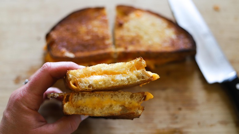 Sourdough is unique to other breads because of its slightly tangy flavor. The fermentation adds another element to your homemade grilled cheese while complementing the rich saltiness of the cheese. Fermentation, however, also goes hand in hand with this bread's texture, helping it rise and giving it a soft, airy quality. The size of it, in turn, only makes for more surface area on the pan — helping you achieve that beautiful browned color on both sides. With all that being said, sourdough gives everything you look for in a good grilled cheese: flavor, color, and a combination of crispy and soft textures. But, it's not the only ingredient in a great grilled cheese.