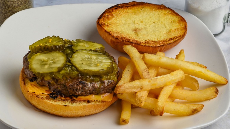 Butter can certainly be a go-to for toasting your burger buns, but it's not the only fat you can use. For example, you can make bacon cheeseburgers even better by toasting your buns in your leftover bacon grease. The buns will pick up on the meaty, umami, and salty flavor of the fat. Alternatively, try making store-bought burger buns taste better by adding a small dab of a condiment you likely already have on hand: mayonnaise. If it makes a great grilled cheese, it must be the secret to a pretty darn good burger bun too, right?