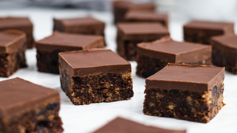 The top layer of chocolate is not the only way to customize this dessert. As mentioned above, the bottom layer can consist of any add-ins you want. So, if you're not a fruit-in-dessert person, you can stick to nuts or even just stick to the flavored graham cracker crust. Or, you can swap out the raisins and cherries for other types of fruit, either dried or fresh — perhaps dried cranberries or dates.