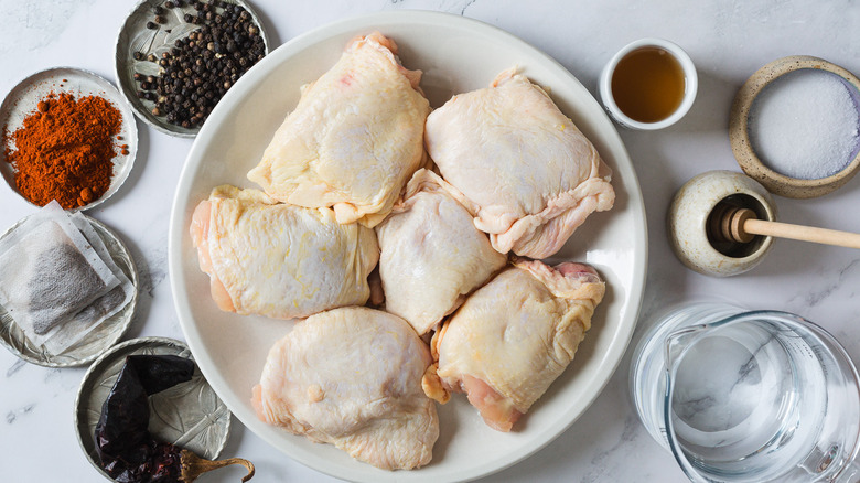 Opt for bone-in, skin-on chicken thighs to ensure that your chicken comes out juicy and flavorful. You can also use chicken breasts, but you'll need to cook them about half the time. Orange pekoe tea provides the body of our marinade. It's used as the base in a sweet brewed tea that we mix with honey, vinegar, and spices to make the marinade and glaze. Other ingredients include boiling water to steep the tea and rehydrate the chipotle peppers, apple cider vinegar for tanginess, smoked paprika for that deep, smoky aftertaste, and salt and black pepper for seasoning.
