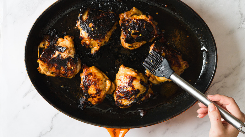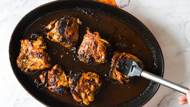 - Transfer the pan to the oven and cook for 25–30 minutes, brushing with the marinade every 10 minutes, until the chicken reaches an internal temperature of 165 F.