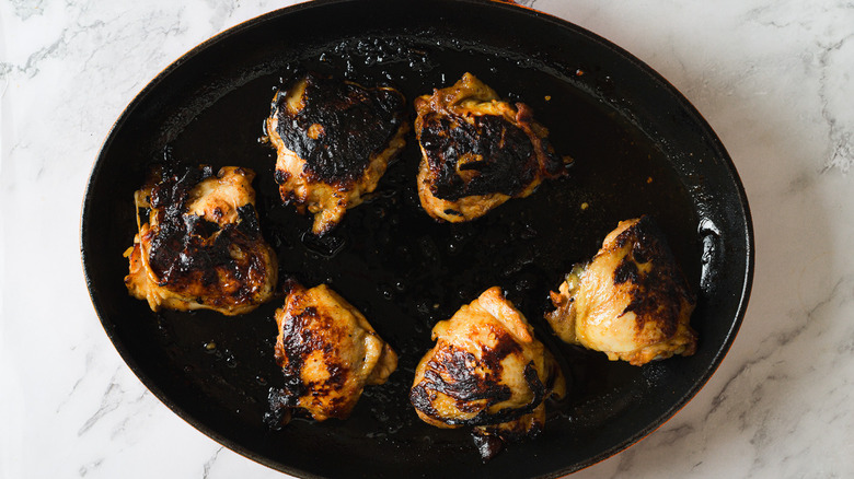 - Place the chicken thighs skin-side down on the grill pan and cook for 5 minutes to sear the skin. Flip and sear the other side for 3 minutes.