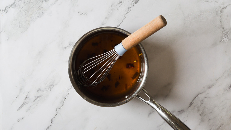 - While the chicken is cooking, make the glaze by combining ¼ cup sweet tea, the remaining 2 tablespoons honey, 1 tablespoon vinegar, and 1 tablespoon diced chipotle pepper in a small saucepan.