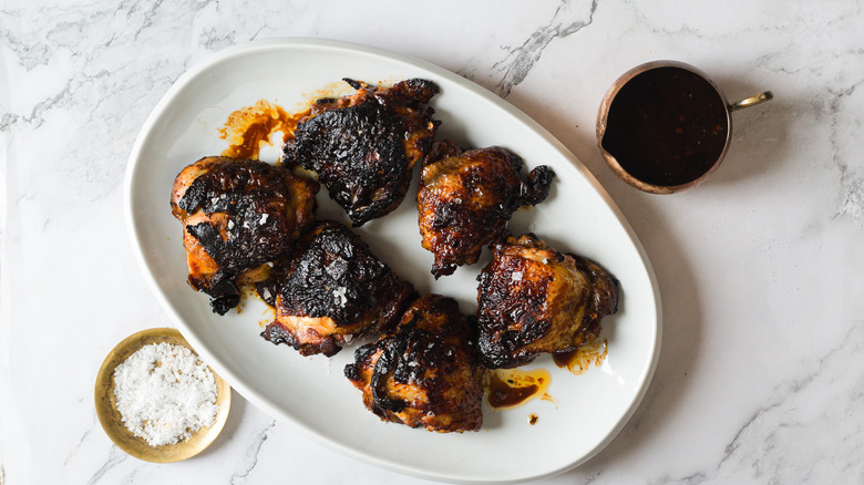 To really do this chipotle sweet tea chicken justice, we suggest that you lean into the Southern potluck and picnic vibe by pairing it with classic, regional sides. Potato salad is an obvious choice — go for a mustard-based variety or one with eggs, pickles and mayo for a creamy contrast to the spicy chicken. Coleslaw is another must-have, whether you prefer a vinegar-based dressing or a creamier version with a touch of sweetness. Baked beans, especially ones made in the slow cooker, make a hearty accompaniment that you can prep in advance. Collard greens are a favorite that let the chicken shine.