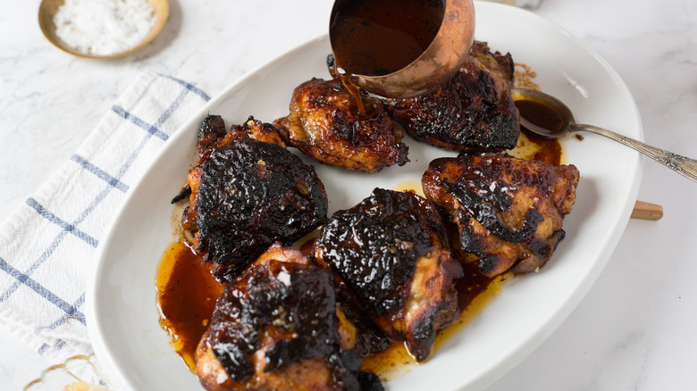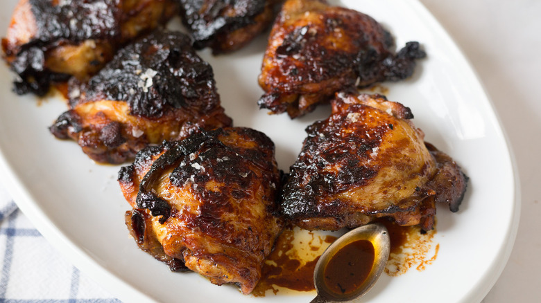 According to Ksenia Prints of At the Immigrant's Table, sweet tea has been a fixture in Southern cooking for a long time, and it turns out to be an excellent brine for chicken. The tea tenderizes the meat, helps crisp the skin, and gives it a deep, golden-brown color when baked. Combined with a glaze that's spiked with rehydrated and chopped chipotle peppers, it makes for a satisfying dish that you could finish in one sitting. This grilled chicken recipe tastes just as good hot or cold, making it perfect for all those summer picnics and potlucks. The combination of the tea's sweetness and the chipotle's heat provides the perfect balance of flavors for a satisfying, more-ish main.