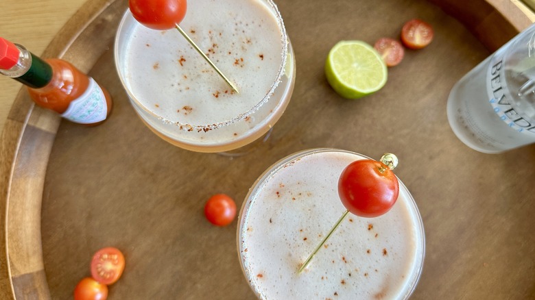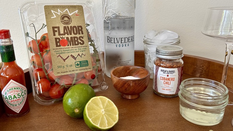 For this recipe, you'll need kosher salt, chile flakes, cherry tomatoes, fresh lime, simple syrup, vodka, hot sauce, and ice. If desired, you can add a large egg white to increase the frothiness.