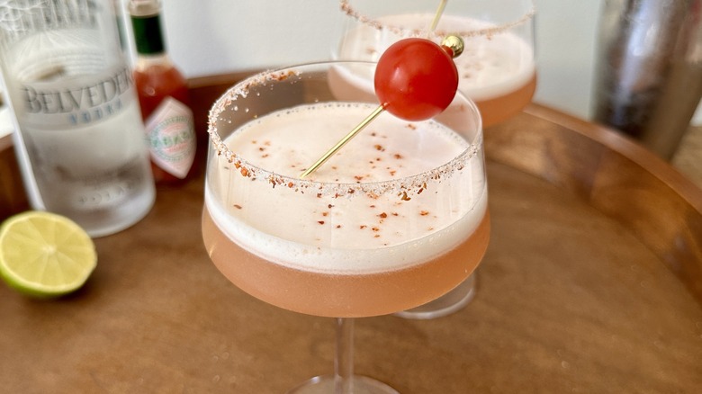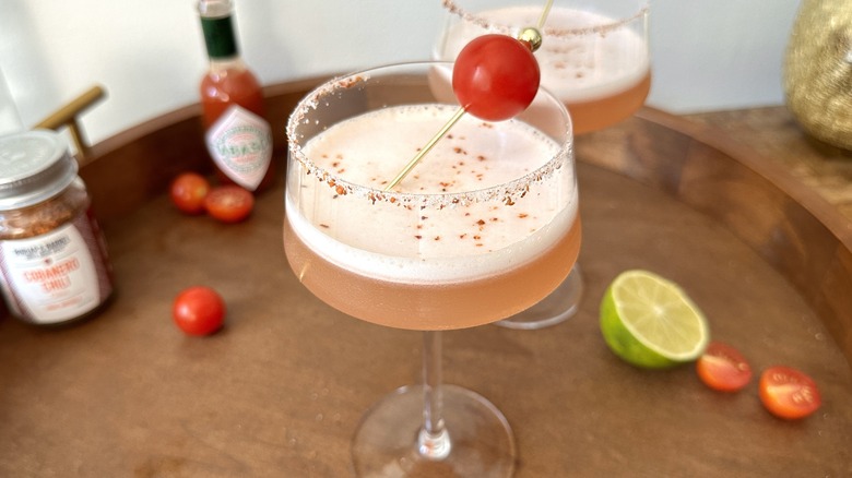 Making cocktails follow classic mixology recipes of tried and true favorites, and others try something entirely new. Tasting Table recipe developer Katie Rosenhouse shares this spicy tomatini recipe, a.k.a. the tomato martini, that you didn't know you needed in your life. It features sweet cherry tomatoes and a kick of hot sauce, and it comes together as a delightful, salmon hue in your glass. Whereas a Bloody Mary features tomato juice, this tomatini is subtler, highlighting everything you love about tomatoes with more finesse.