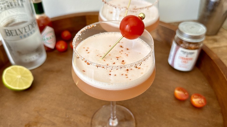 Muddled cherry tomatoes make this a one-of-a-kind vodka martini, and we amp things up further with a dash of hot sauce and a sprinkle of chile-infused salt.