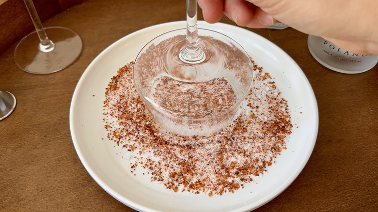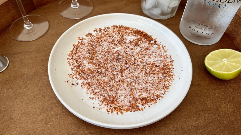 - On a rimmed plate, stir to combine the salt and chile flakes.