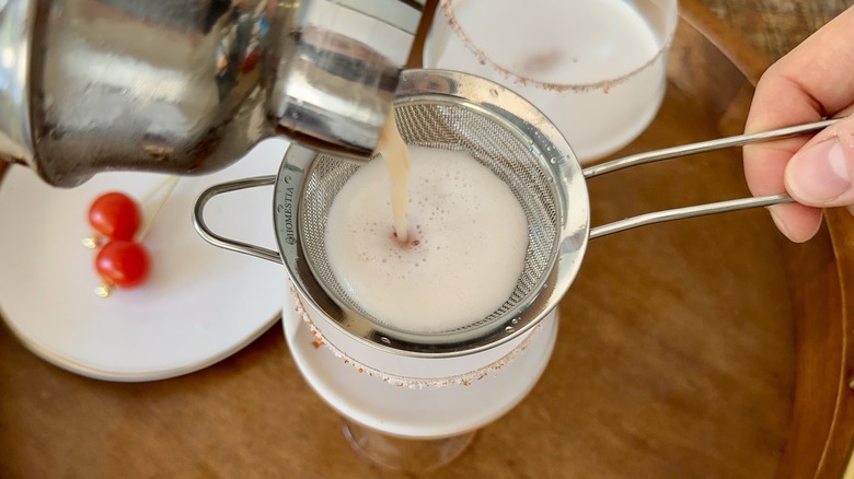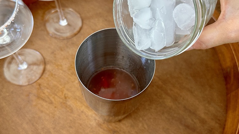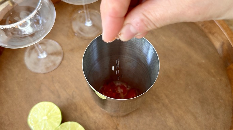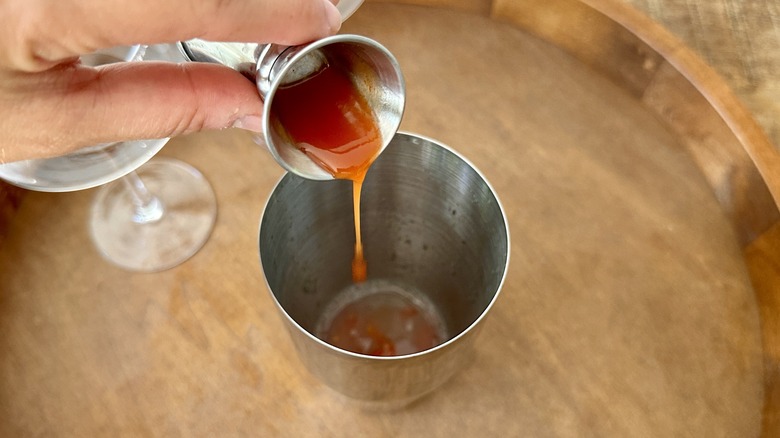 Simple syrup is an important component of this spicy tomatini and many other cocktails. You can certainly buy a bottle of it, but if you don't have any on hand, it's easy to make and only requires sugar and water. Rosenhouse instructs, "Combine equal parts water and sugar in a small pot, then stir gently and bring to a simmer." You'll want to keep stirring until the sugar granules dissolve, then take the pot off the heat and let it cool down entirely before using it in your cocktail.