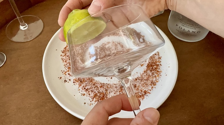 - Cut the lime in half and rub one half gently around part of the rim of two martini or coupe glasses.