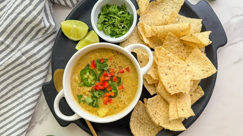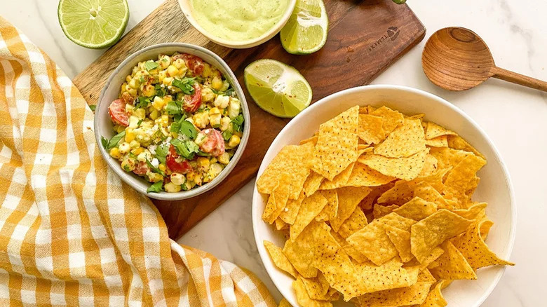 As with other Mexican elote or esquites recipes, this elotes-style corn dip from recipe developer Miriam Hahn puts the charred corn kernels front and center, accompanied by creamy, tangy, and spicy flavorings. Interesting inclusions here are grape tomatoes for juicy textural intrigue, plus avocados for extra-creamy dressing. Hahn tosses out a tip for kicking things up a bit: Invite a spicier serrano pepper to the jalapeño party. No matter which chilis you use, don't skip the Tajin seasoning — it's a defining flavor of this dip. Serve with tortilla chips or crisp leaves of lettuce.