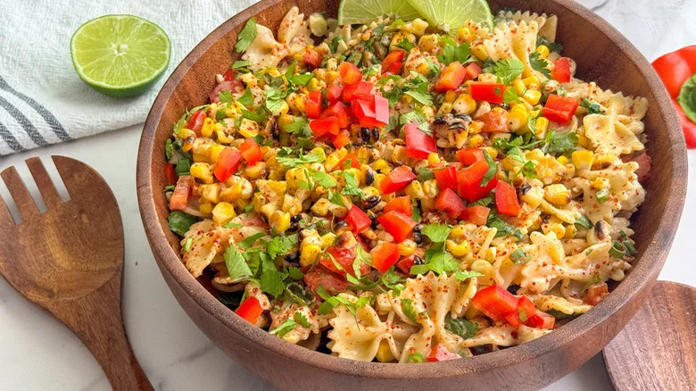 This esquites-inspired pasta salad is another refreshing recipe by Miriam Hahn, this time using a bow-tie pasta twist. In her charred Mexican street corn pasta salad, the filling noodles turn the classic side dish or snack into an entree. You'll be cutting charred corn off the cob, then tossing it with homemade dressing and plenty of earthy spices. Hahn shares helpful ideas for personalizing this salad, including spicing it up or down, and adding things like guacamole, black beans, shrimp, or grilled chicken.