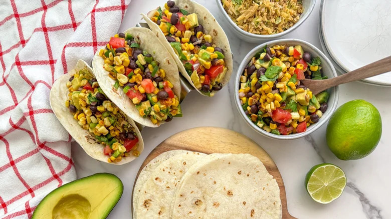 Corn makes a bright presence in many Mexican dishes, especially when bearing those telltale char marks for smoky flavor. In this recipe, the kernels meet an unexpected meal mate: super nutritious Brussels sprouts. The shredded sprouts get tidily tucked inside tacos, joined by homemade charred-corn salsa. Black beans feature in the mix, along with iconic taco-party cohorts such as tomatoes, jalapeños, cilantro, lime juice, cumin, chili powder, and more. The fillings are ready rumble in about 20 minutes.