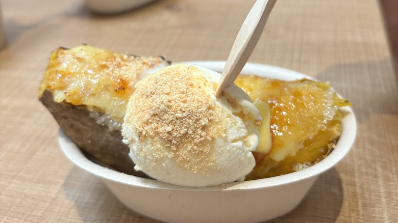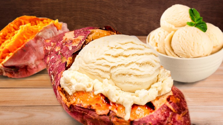 Even without swirling cinnamon and brown sugar into mashed sweet potatoes or dotting a sweet potato casserole with marshmallows, these bright orange tubers live up to their name. Their sweetness extends to desserts, like sweet potato pie or sweet potato brownies, but all you need is a sprinkling of sugar and a scoop of ice cream for a show-stopping treat. Brûléed sweet potatoes provide that elegant burnt sugar topping that'll shatter into a melt-in-your-mouth, warm, custardy pulp. A scoop of ice cream is the perfect accompaniment to complement the earthy sweetness and custard-like textures of sweet potatoes with a refreshingly cold and decadently creamy contrast. Plus, you can get creative with ice cream flavors and additional toppings.
