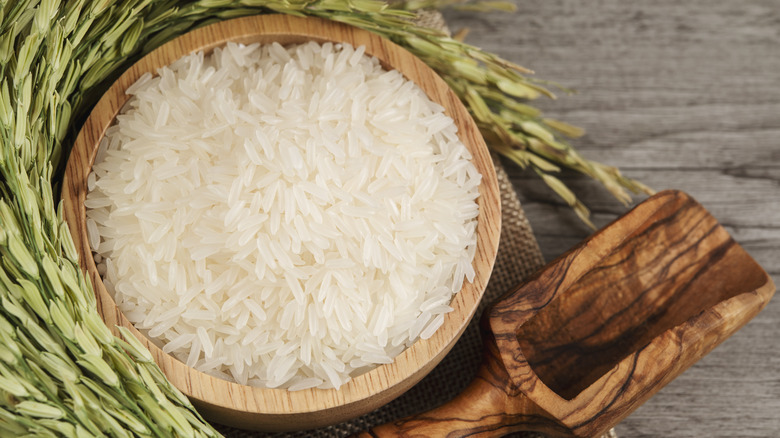 The two types of rice you're likely to encounter at Thai restaurants — jasmine rice and sticky rice — couldn't be more different in texture and aroma. Jasmine rice, which you might enjoy on the side with your dinner, has distinct, firm grains when cooked. It's fluffy with a slightly soft bite and savory aroma. Then there's sticky (aka glutinous) rice that's sometimes served in a little woven basket. It clings fiercely together in clumps, making it perfect for sliding across your plate to get every last saucy bit of flavor from a dish. You've likely also seen sticky rice in the sweet Thai dessert coconut rice with mango. What causes these two types of rice to be so different when cooked turns out to be the kind of starch that's found in the grains.