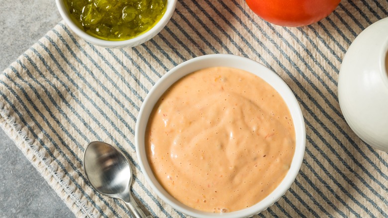 The "secret is in the sauce," as they say, so don't skimp when it comes to drizzling on the dressing. Surprisingly, a homemade Thousand Island dressing can be achieved by mixing together some pantry and fridge staples like garlic, mayonnaise, ketchup, sweet relish, apple cider vinegar, and a dash of salt.