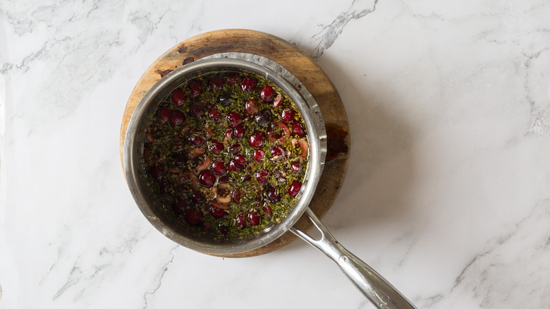 - In a saucepan, combine the balsamic vinegar, ½ cup cherries, honey, minced garlic, olive oil, thyme, salt, and pepper.