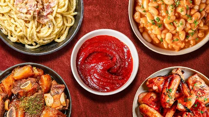 Cut the paste with some honey and vinegar, and then add it to the pan while you're cooking the pancetta. This will help it blend in with the other ingredients so it coats your pasta easily. Then, just finish off your carbonara recipe like usual, and you'll have an updated pasta dish that's hard not to love. It may not be traditional, but it is delicious.