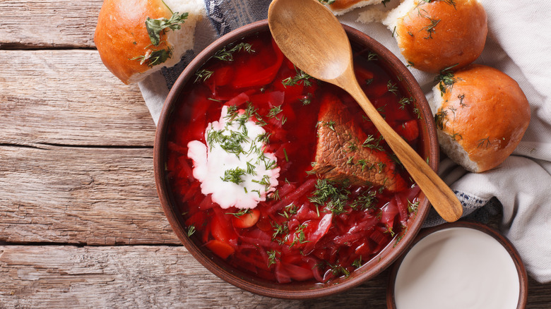 The soup is intensely earthy, a flavor that comes from the beets themselves, but that flavor is balanced out by the creamy elements of the milk and sour cream. Onions and chicken stock add a layer of savoriness to the finished dish, and salt and pepper provide an extra punch of flavor that brings everything together. Borscht can be served hot or cold, depending on the weather and the preferences of the eater.