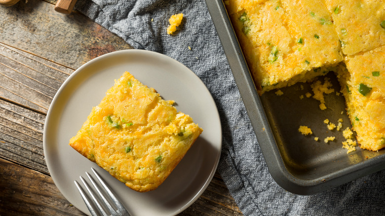Are you craving croutons but find yourself all out of cornbread? You don't have to wait until tomorrow to enjoy this crispy, crunchy topping — but you will need to have some patience. When making homemade cornbread specifically for croutons, trade out your cast iron skillet or cake pan for a rimmed sheet pan. By baking your bread on a thin sheet, your bread will bake faster and be dryer, without a tender center. It will also be a better thickness for crouton-making, meaning you can simply slice it into squares instead of having to cut each thicker piece crosswise to get bite-sized pieces. Be sure to line the pan with parchment paper for easy removal.