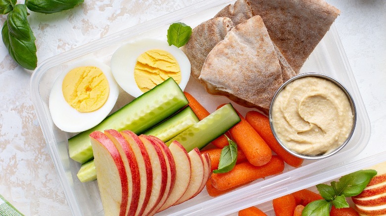 When building the lunch box of your dreams, look to pack at least one protein-heavy component to help keep you satiated until your next meal. Once you have servings of crispy chickpeas, homemade beef jerky, seasoned edamame, or the deli meats of your choosing, you can select which sides you'd like to complete your meal. Add extra crunch with crackers and popcorn or tuck folded pita bread or tortillas into a container for easy assembly with the other ingredients in your lunch. Slices of fruits and vegetables can help you remember the days when your lunch box was packed for you, and a little extra sweet treat can turn lunchtime into an occasion that feels more like a reward than an item to check off your to-do list. Chocolate-dipped pretzels, no-bake protein balls, or cubes of banana bread can be the sweet finish a packed lunch deserves.
