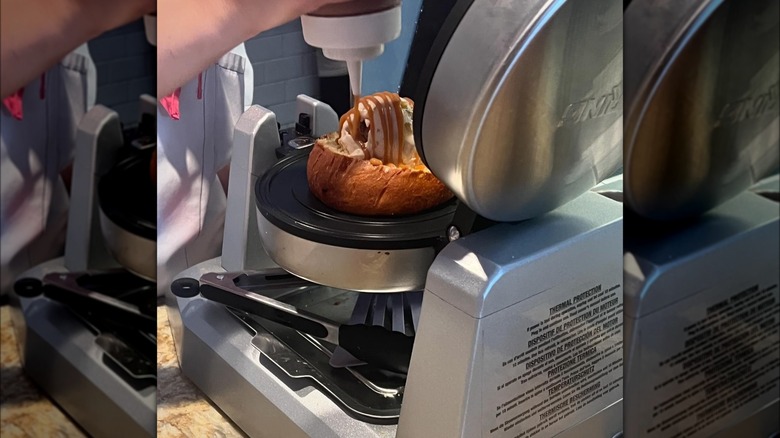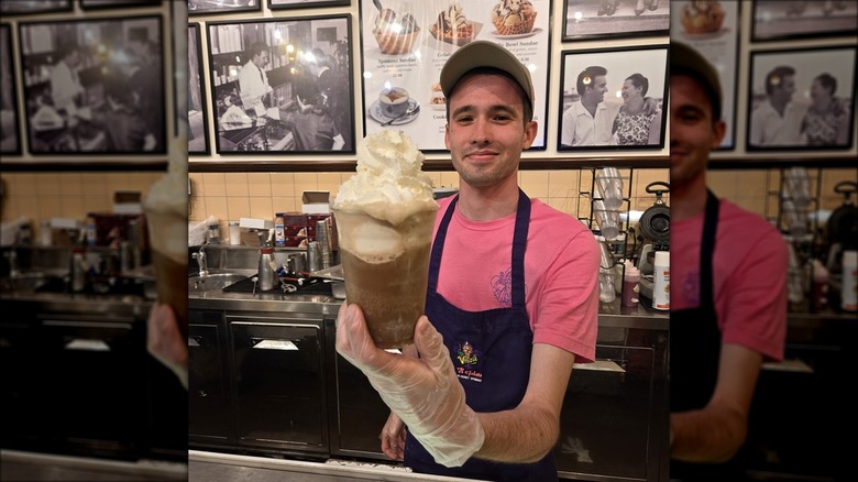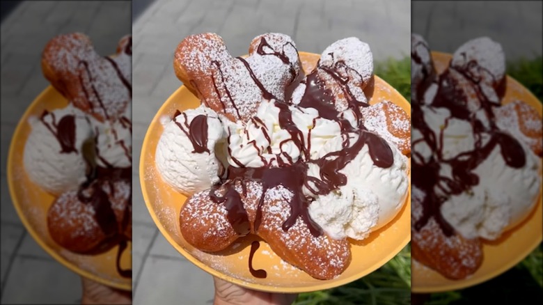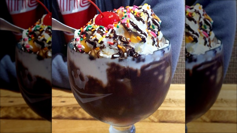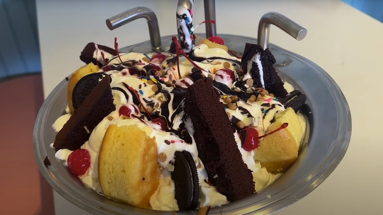 If you happen to be going to the Yacht and Beach Club, which is accessible via a short walk from Epcot, stop at Beaches & Cream Soda Shop. It offers plenty of different sundaes, but the biggest and most incredible of them all is the Kitchen Sink. This one includes five scoops of different ice cream flavors and all toppings the restaurant has for ice cream. Plus, you can augment the recipe for more of a chocolate-forward experience or even one of a more Neapolitan persuasion. Also, quite famously, there's a whole can of whipped cream in this massive dessert. It serves four people, and it's definitely Disney bucket-list worthy.