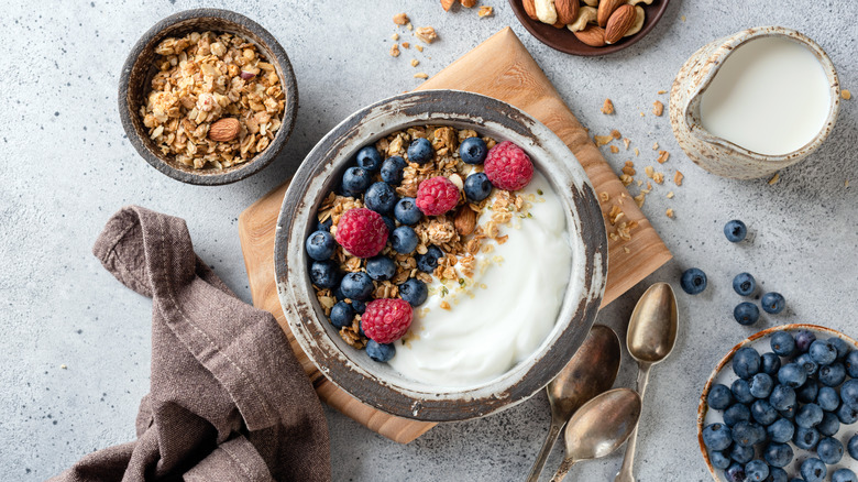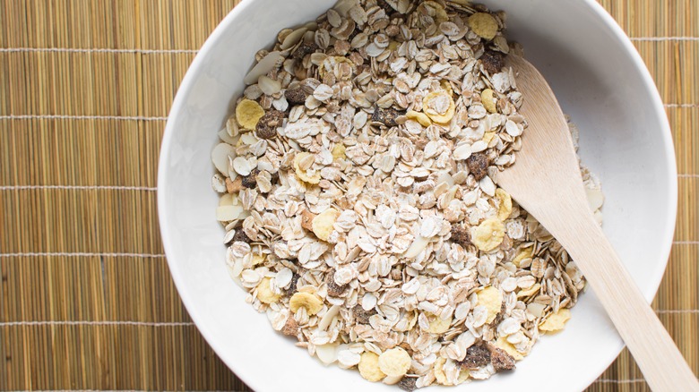 Before unpacking the differences, it can be helpful to start with a foundational reminder of what these two varieties actually are. The chief ingredients in granola are rolled oats, crushed nuts, and honey. Granola is commonly served as a topping over yogurt or oatmeal, or snacked on straight out of the bag. Muesli (pronounced mews-li) is a mixture of fruit, nuts, and grains. It's often enjoyed with milk as a breakfast cereal (also notably lower in sugar and calories than many boxed breakfast cereals). Another popular serving style is to soak muesli in milk or yogurt in the fridge "overnight oats" style, or it can be incorporated into baked goods like muffins, cookies, or pancakes.