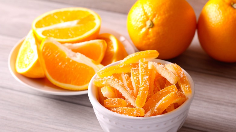 Take your leftover citrus peels and trim away as much of the white, bitter pith from the inside as possible. Once you're left with only the fragrant outer rind, slice into thin strips. From there, blanch the rinds in boiling water a few times to remove their astringency and soften the peels. Then, the peels are simmered in sugar and water for about an hour. The candied peels can be stored directly in their sugar syrup, but most recipes will have you air dry the sugar-soaked peels for a day or two on a rack, before tossing them in sugar to coat and keep them separated. From there, the sugar-coated peels can be stored at room temperature in an airtight container.