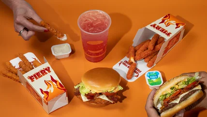 The lowest level of spice on Burger King's new menu will be the drink, Fiery Strawberry & Sprite, which uses a strawberry puree with a little kick of heat. Level two is the Mozzarella Fries, a thinner version of mozzarella sticks that are filled with peppers and coated in a Calabrian chile pepper breading. The Fiery Bacon Whopper represents the middle ground on the heat chart, with pepper jack cheese, lettuce, tomato, and a spicy sauce joining the ¼-pound beef patty and bacon. Chicken Fries marinated in a spicy seasoning and finished with a garlic and pepper breading are at level four for heat. And finally, for the real heat seekers, the Fiery Royal Crispy Chicken Sandwich offers a triple hit of Fiery flavor with a spicy glaze on the chicken, crispy Fiery-seasoned bacon, and a creamy hot sauce alongside the pepper jack, lettuce, and tomato.