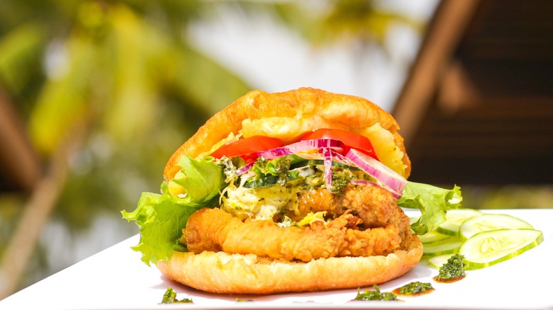 In essence, bake and shark is a simple fried fish sandwich, albeit with a very specific Caribbean twist. The bread (or "bake") is soft, slightly sweet fried dough that puffs when cooked to produce a pocket that's perfect for stuffing — not unlike a Caribbean take on pita bread. The fish portion of the sandwich (or "shark") is traditionally a piece of filleted blacktip shark that's been marinated, seasoned, and fried until crispy on the outside and tender on the inside. If eating shark doesn't sit right with you, you can always ask for another flaky white fish substitute. Many stalls sell versions of bake and shark that contain no shark at all, but rather tilapia, skate, or catfish.