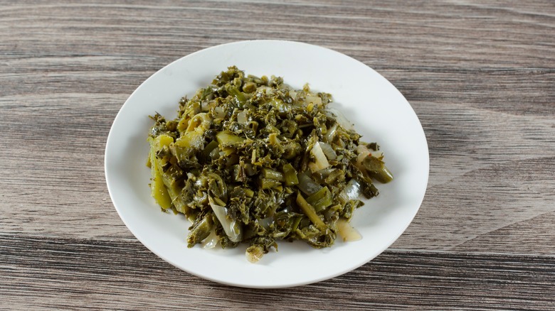 Made from the leaves of the amaranth, dasheen, or taro plant, callaloo gets its unique depth of flavor from a slow simmer with aromatic ingredients like onions, garlic, and thyme, sometimes with the addition of coconut milk or crab meat. If you're attempting to make callaloo at home, finding the correct combination of leafy vegetables can prove a challenge. In some recipes, callaloo refers to both the name of the dish and the plant used to make it, while others name specific leafy greens. Either way, these tropical plants can be difficult to come by stateside, and many recipes will suggest using a blend of spinach and collard greens to achieve a similar texture. Just be sure to order a traditional bowl of callaloo during your next visit to a Caribbean paradise.