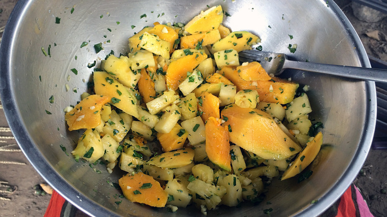 Like a spicy fruit salad, chow is a refreshing blend of sweet fruit, sour citrus, hot chilis, and savory herbs that makes it easy to squeeze in your daily dose of vitamin C. Some spice lovers will add super-hot peppers into the mix, but there's a method to the madness. The capsaicin from the hot peppers can cause you to sweat, instantly cooling your skin beneath the steamy Caribbean sun. So instead of shrinking back from the spice, add an extra serving of hot chili to your chow to enjoy as you stroll along the beach.