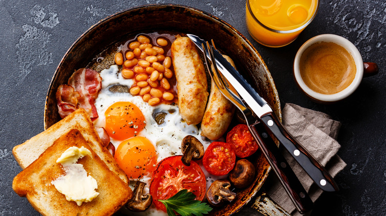 Tomatoes are light, juicy, and acidic, which helps to cut through the richness of all the greasy fried pork items and complement the sweetness in the baked beans. A burst of juiciness is a great textural contrast to the meaty chew of bacon, sausage, and black pudding. Aesthetically, tomatoes provide a pop of color, while their umami-rich flavor only enhances the savoriness of the meat and eggs. Many full English breakfast recipes recommend grilling tomatoes to further enhance their juiciness while also adding a sweet and smoky depth to their flavor profile. You can also fry them up in a skillet like the rest of the ingredients, halved and cut side down with a sprinkle of salt and pepper.