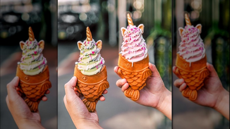 Taiyaki focuses on soft serve ice cream. You'll find matcha soft serve, served with an accompanying mochi stick. But you'd be best off ordering one of the more traditional preparations of this dessert, which features the fish-shaped waffle cone filled with red bean paste and custard. You will also have the option to choose one of its signature cones — or build your own, which offers tons of opportunities for customizing and exploring different pairings.