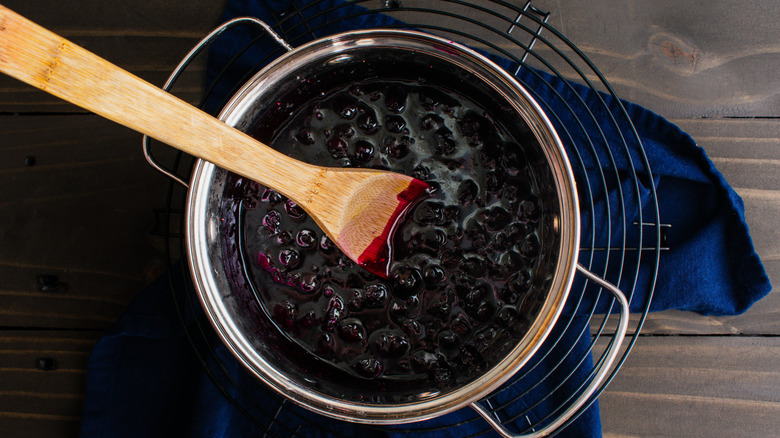 A stack of pancakes becomes a dreamy dessert when drizzled with homemade blueberry syrup. And while you may think that assembling a homespun syrup sounds like a long job that involves a selection of sugar thermometers and bubbling saucepans, it's actually an easy process that's far breezier than making a fruit preserve. Simply add fresh blueberries, sugar, and a squeeze of lemon juice to a pan and heat gently until thickened. However, the one trick that will instantly transform your syrup from simple to scrumptious is to press the berries with the back of a wooden spoon to help release their juice.