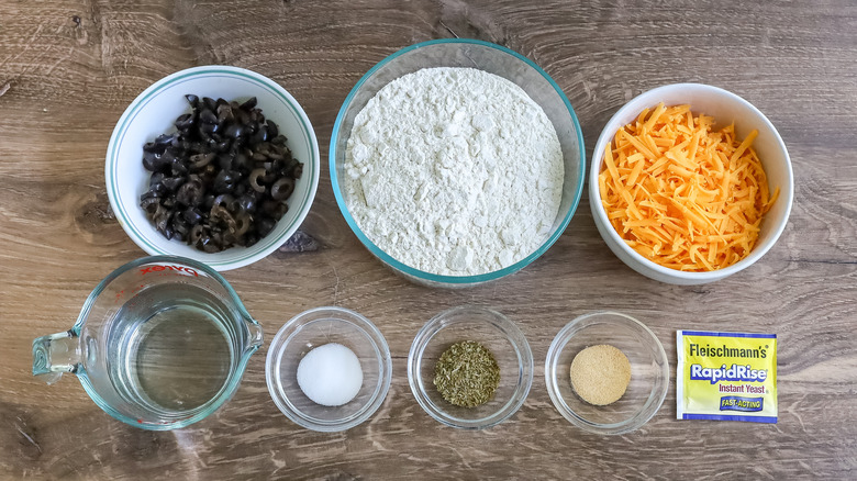 Gather the ingredients for this no-knead olive cheese bread