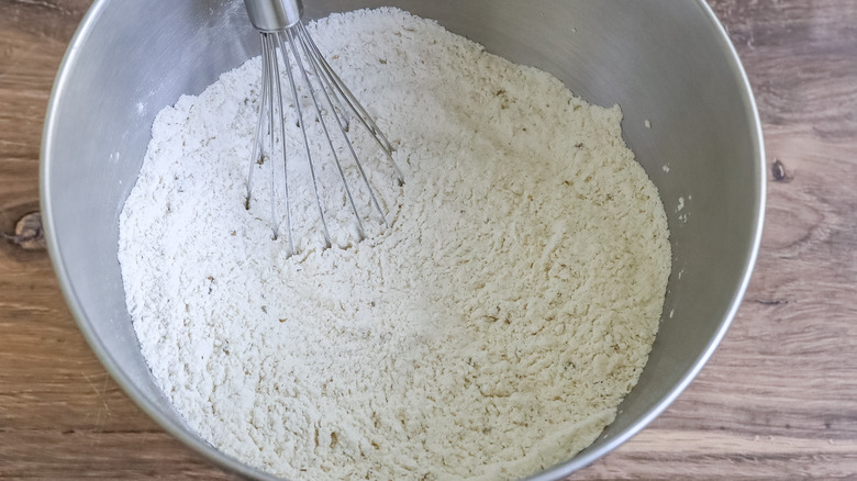 - In a large mixing bowl whisk together the flour, yeast, salt, oregano, and garlic powder.