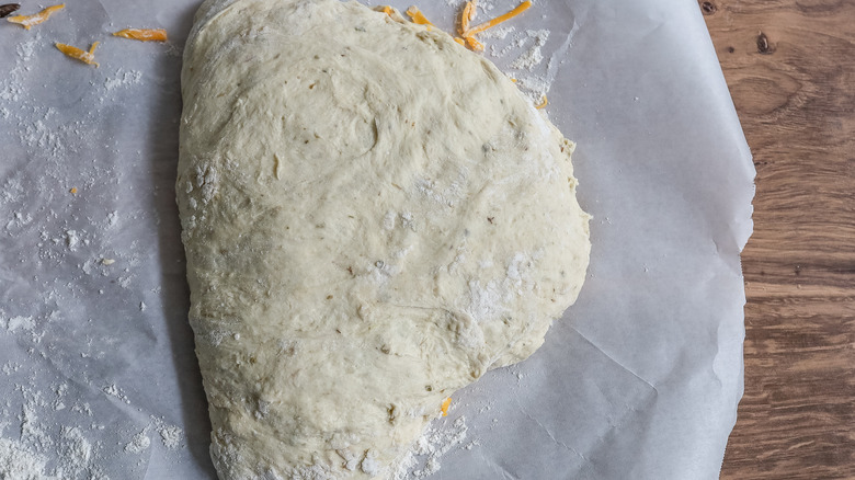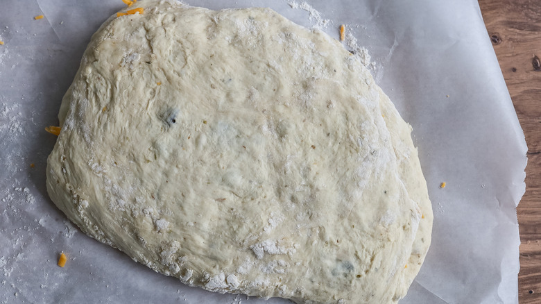 - Meanwhile, add the dough to a lightly floured piece of parchment paper and press it flat.