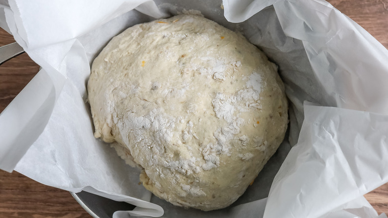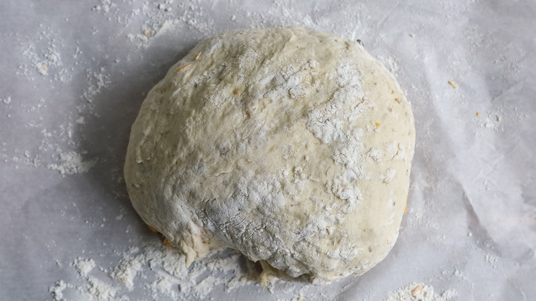 - Fold the dough over one more time, and then shape it into a ball with the seam of the layers facing down on the parchment paper.
