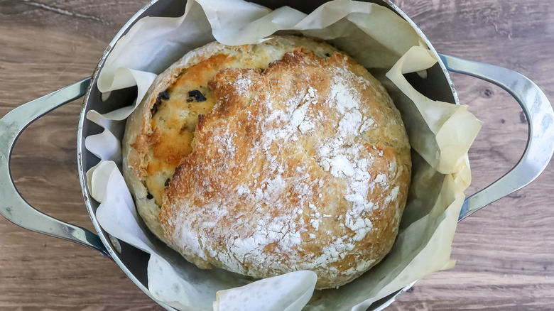 - Remove the parchment paper with the bread on it from the Dutch oven, let the bread cool for at least 10 minutes and then slice and serve.