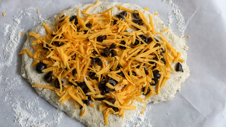 Sprinkle the dough with about one-third each of the chopped olives and shredded cheddar.