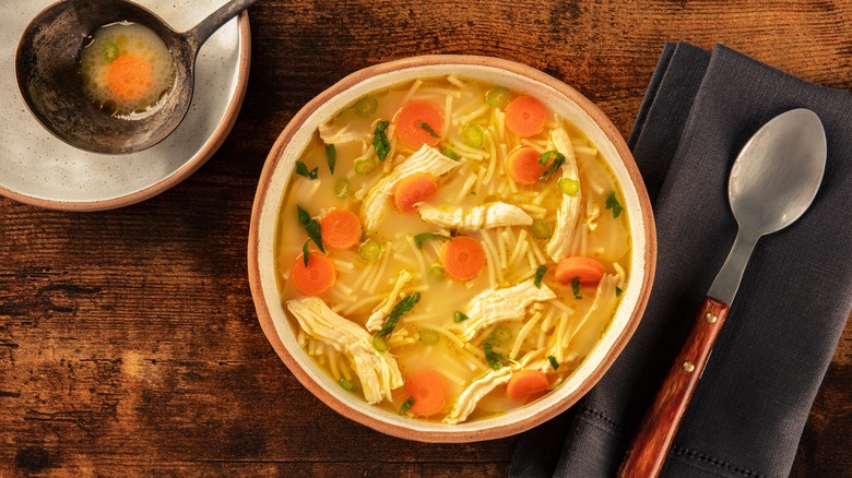 Honestly, most savory dishes can benefit from the boost of flavor fish sauce can provide, but perhaps one of the best dishes to add it to is chicken noodle soup. This is a soup that already contains plenty of salty, savory elements: There's the chicken broth which, if done right, is rich in salty flavors, as well as the chicken itself and a variety of veggies like celery and carrot. Add some fish sauce to your chicken noodle soup, and it'll highlight those flavors even more while adding an umami note to the finished dish.